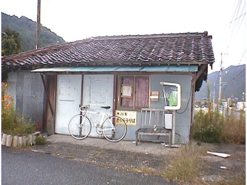 町に入ってすぐの米川駅の昔お店と切符売場だった家の軒下をかりて雨の通過