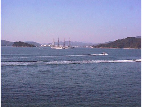撮影した画像 橘町の立岩、大島沖に浮かんでいる日本丸、