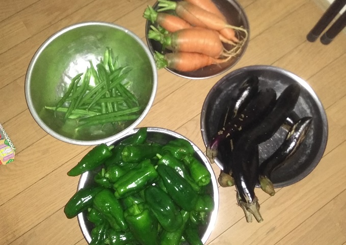 今日の収穫、ニンジンとインゲンになすびとピーマン(^^)