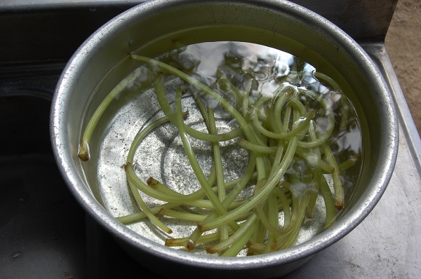 庭に自生しているフキを取って皮をむいて水に浸けておいた。
