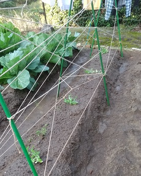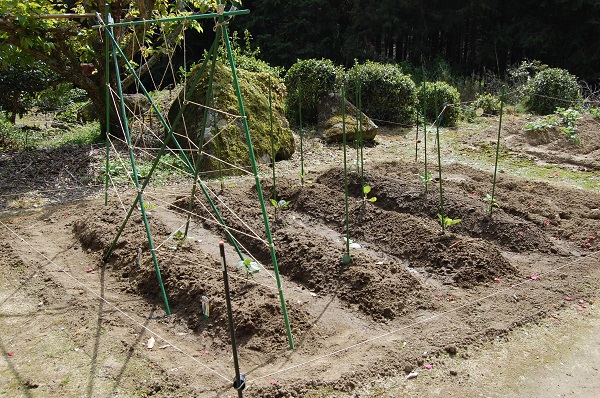 今日は、エンドウの苗を植えた。支柱を立てて麻ひもで細工して、つるが