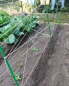 先日植えたキュウリに蔓が巻き付くように細工してナスとピーマンに