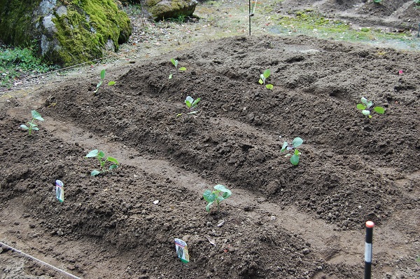畑に元肥を蒔いて畝を作って植え付けをした。畑は冬のうちに堆肥などで耕して