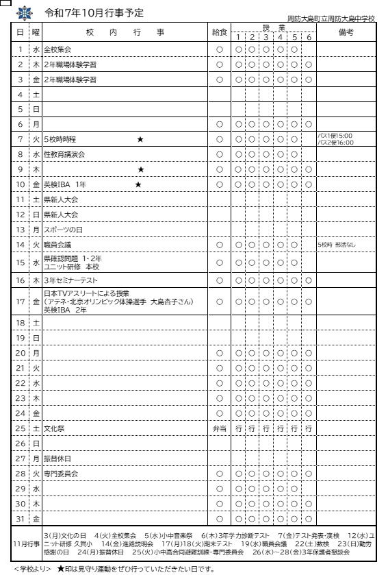 *SB(スクールバス)予定表(10月分)・・・・森野&椋野  日良居&安下庄  油田&沖家室