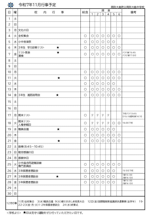 *SB(スクールバス)予定表(11月分)・・・・森野&椋野  日良居&安下庄  油田&沖家室