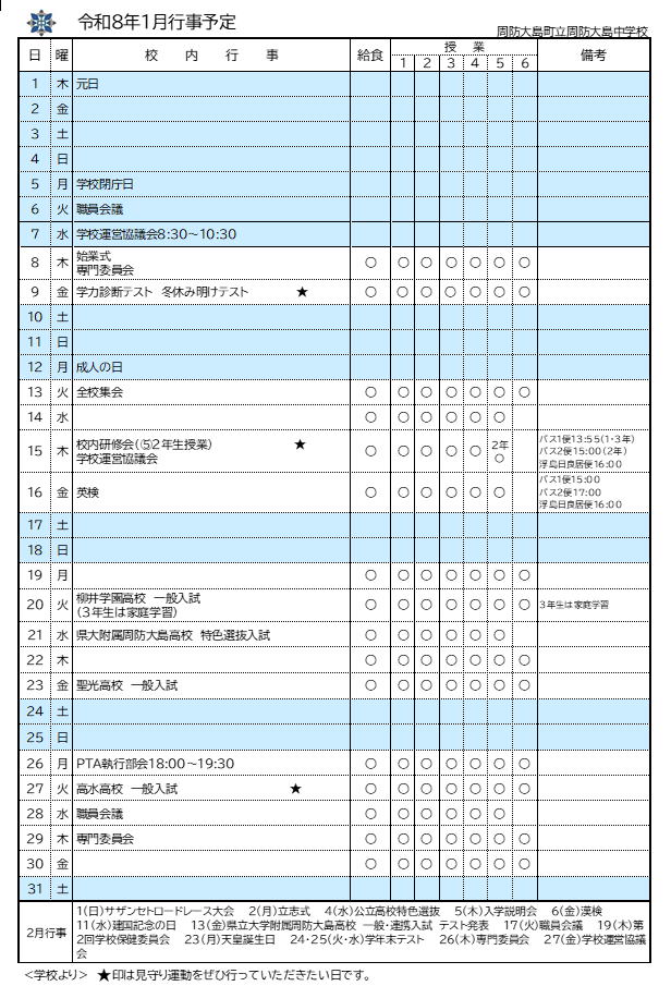 *SB(スクールバス)予定表(1月分)・・・・森野&椋野  日良居&安下庄  油田&沖家室