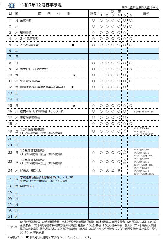 *SB(スクールバス)予定表(12月分)・・・・森野&椋野  日良居&安下庄  油田&沖家室